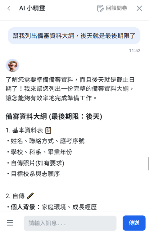 模擬各式面試情境,從常見到刁鑽問題一網打盡!透過實戰練習,提升臨場反應,自信迎戰每位教授,展現最好的自己。
